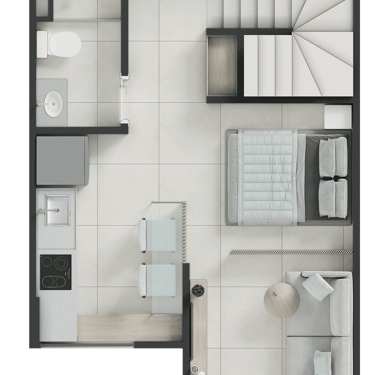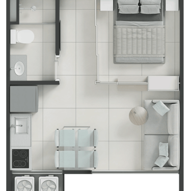 Tipo: Studio e 2 quartos de 24,89m² e 46,12m²